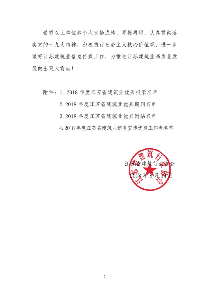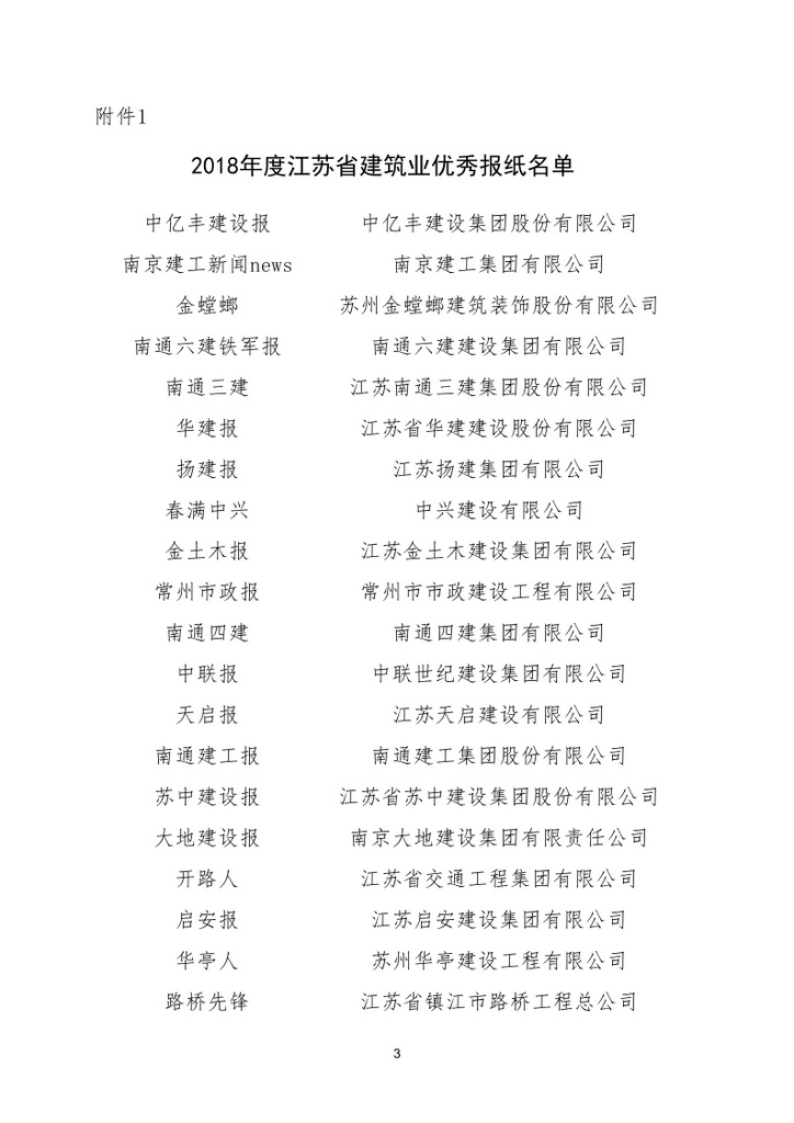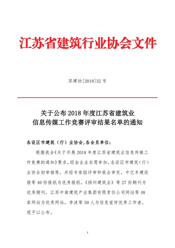2018年8月,江苏省建筑业协会发布《关于公布2018年度江苏省建筑业信息传媒工作竞赛评审结果名单的通知》,由公司主办的《江苏省安》报被评为江苏省建筑业优秀报纸,而公司网站继被中国安装协会评选为优秀网站后再度被江苏省建筑业协会评为优秀网站!