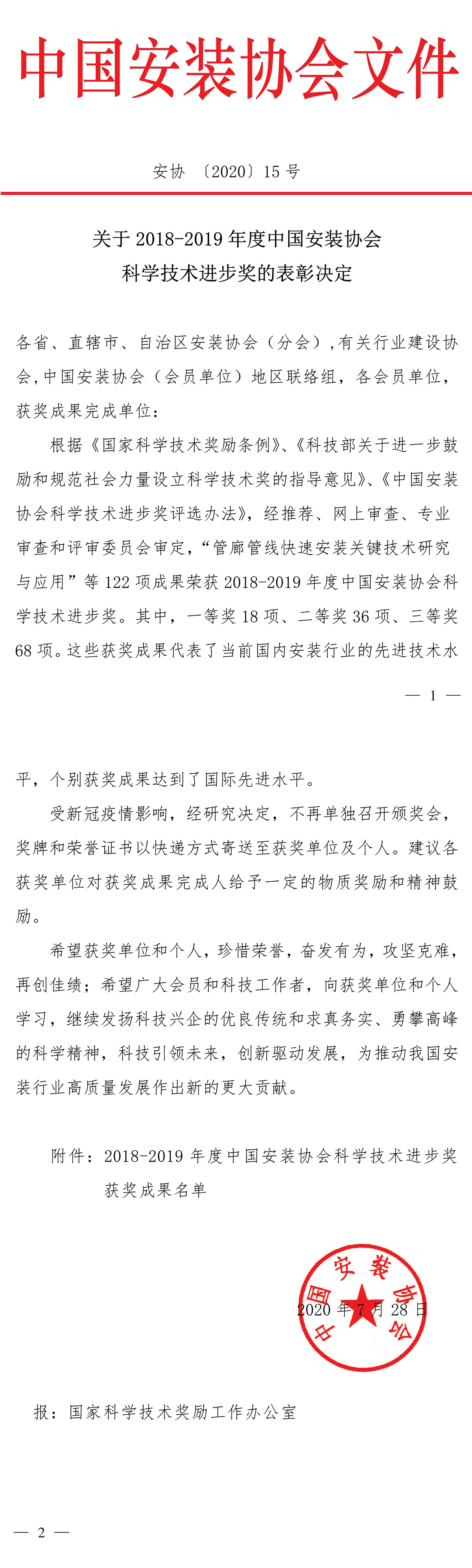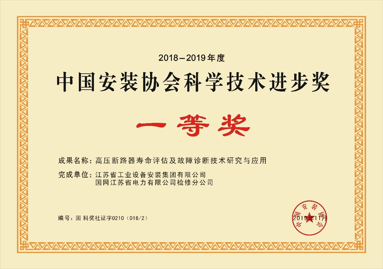 8月4日,中国安装协会颁布了《关于2018-2019年度中国安装协会科学技术进步奖的表彰决定》,江苏省安申报的《高压断路器寿命评估及故障诊断技术研究与应用》荣获一等奖;《超长距离复杂地层大直径管道与光缆定向穿越技术》荣获三等奖。