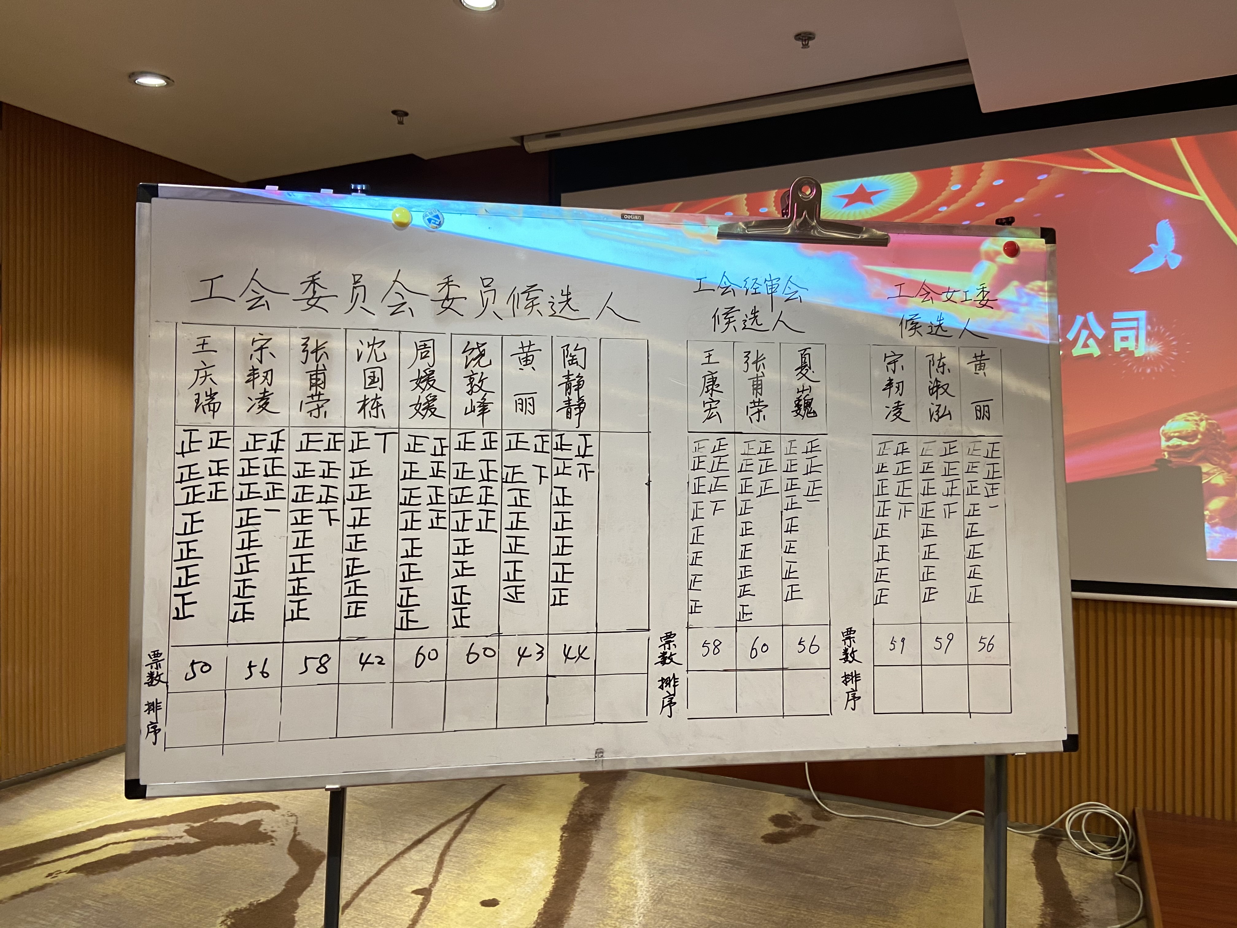 在第二会场,由公司党委副书记赵成显同志主持召开了“三委会”的选举会议。会议以无计名投票的方式选举饶敦峰同志当选工会主席,周媛媛同志当选工会副主席,张甫荣同志当选经费审查委员会主任,宋韧凌同志当选女工委员会主任。