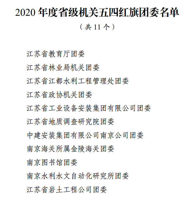 为表彰先进、树立榜样,引导和激励全省各级团组织和广大团员、团干部比学赶超、创先争优,共青团江苏省委授予了一批荣誉称号并希望受到表彰的集体和个人以此为新的起点,不忘初心跟党走,接续奋斗新征程,勇担重任建功新时代。其中,我司被授予“2020年度省级机关五四红旗团委”荣誉称号。