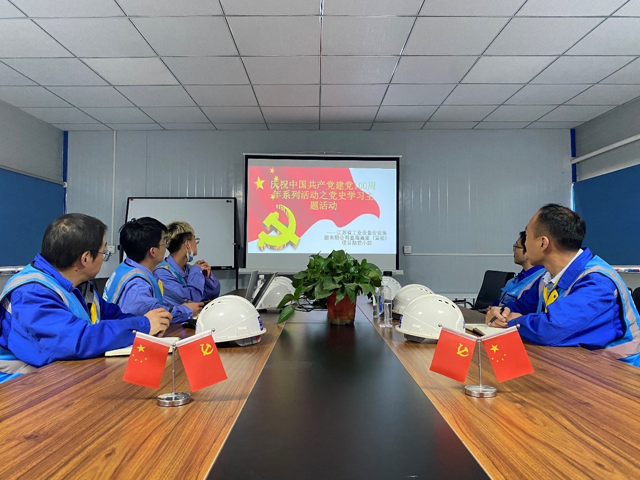 工业分公司党支部张家港项目部经理王俊峰组织现场的党员和技术骨干进行党史学习教育,争创优质工程,为党的100周年献礼!