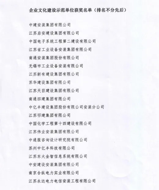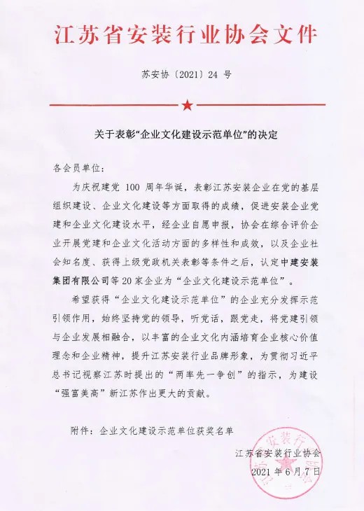 为庆祝建党100周年华诞,江苏省安装行业协会表彰了一批在党的基层组织建设和企业文化建设等方面取得成绩的单位,江苏省安荣获企业文化建设示范单位称号。