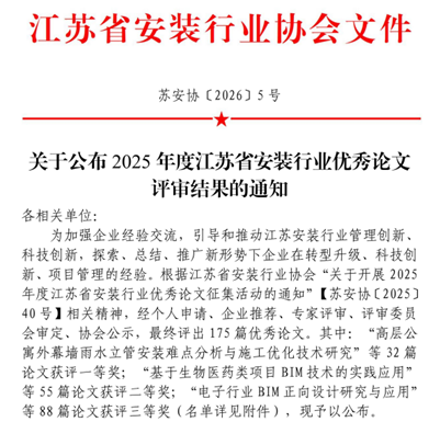 近日,江苏省安装行业协会公布了2025年度优秀论文评选结果,公司报送的论文凭借扎实的实践基础和显著的实用价值,在评选中表现突出,共29篇论文获奖,其中一等奖7篇、二等奖8篇、三等奖14篇。